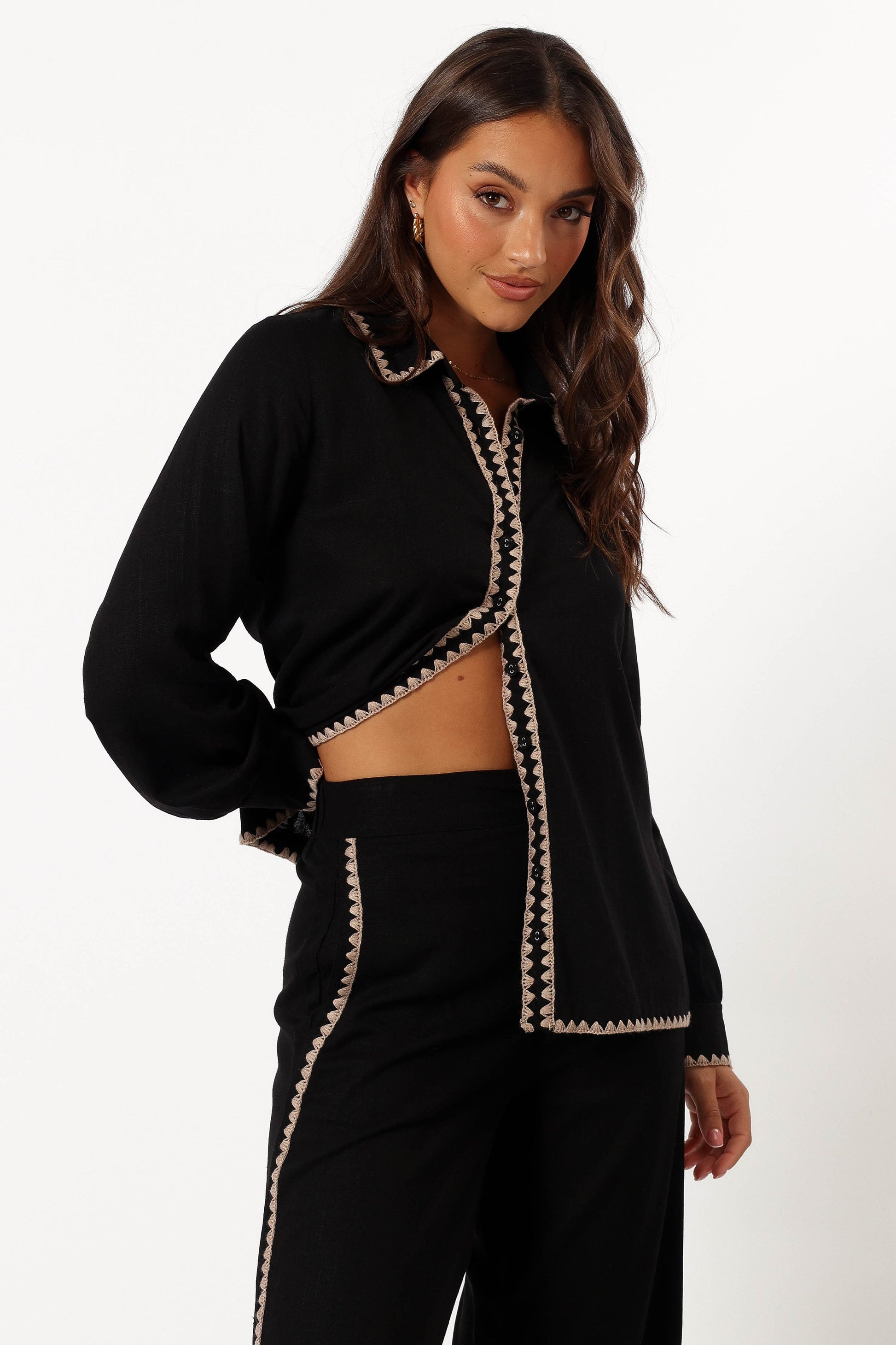 Discover our Calyse Top in Black, it's chic linen spread collar shirts for women is crafted with long sleeves, functional buttons, and stylish contrast stitching - perfect for any season. Unlined for lightweight comfort. Explore now!