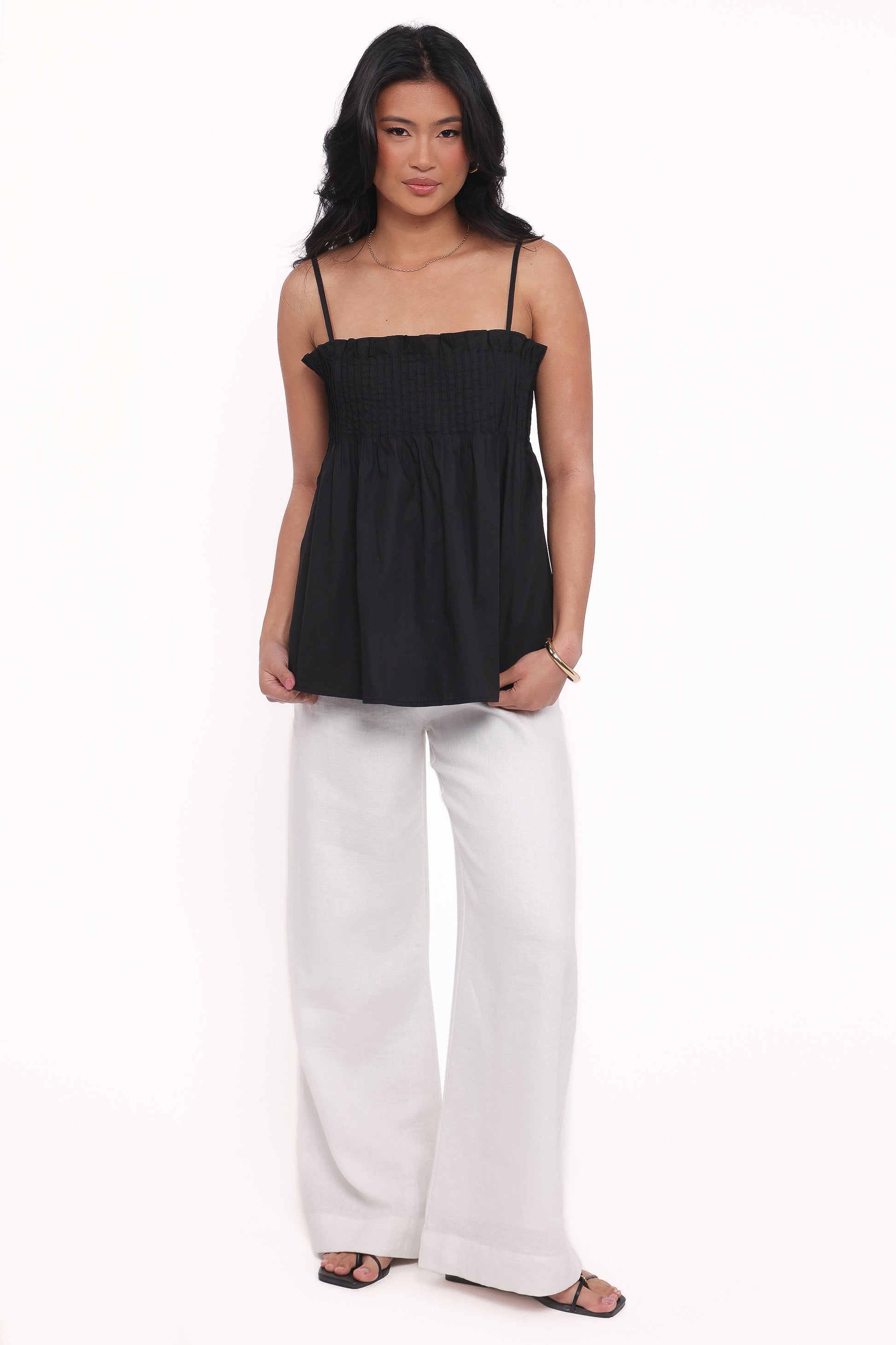 The Carson Pleated Top in White is the effortless statement piece your wardrobe needs. Featuring a pleated bodice, a square neckline, and delicate spaghetti straps, it's designed for chic comfort. The frill hem adds just the right amount of detail, making it perfect to pair with jeans or a flowy skirt for a polished, on-trend look.