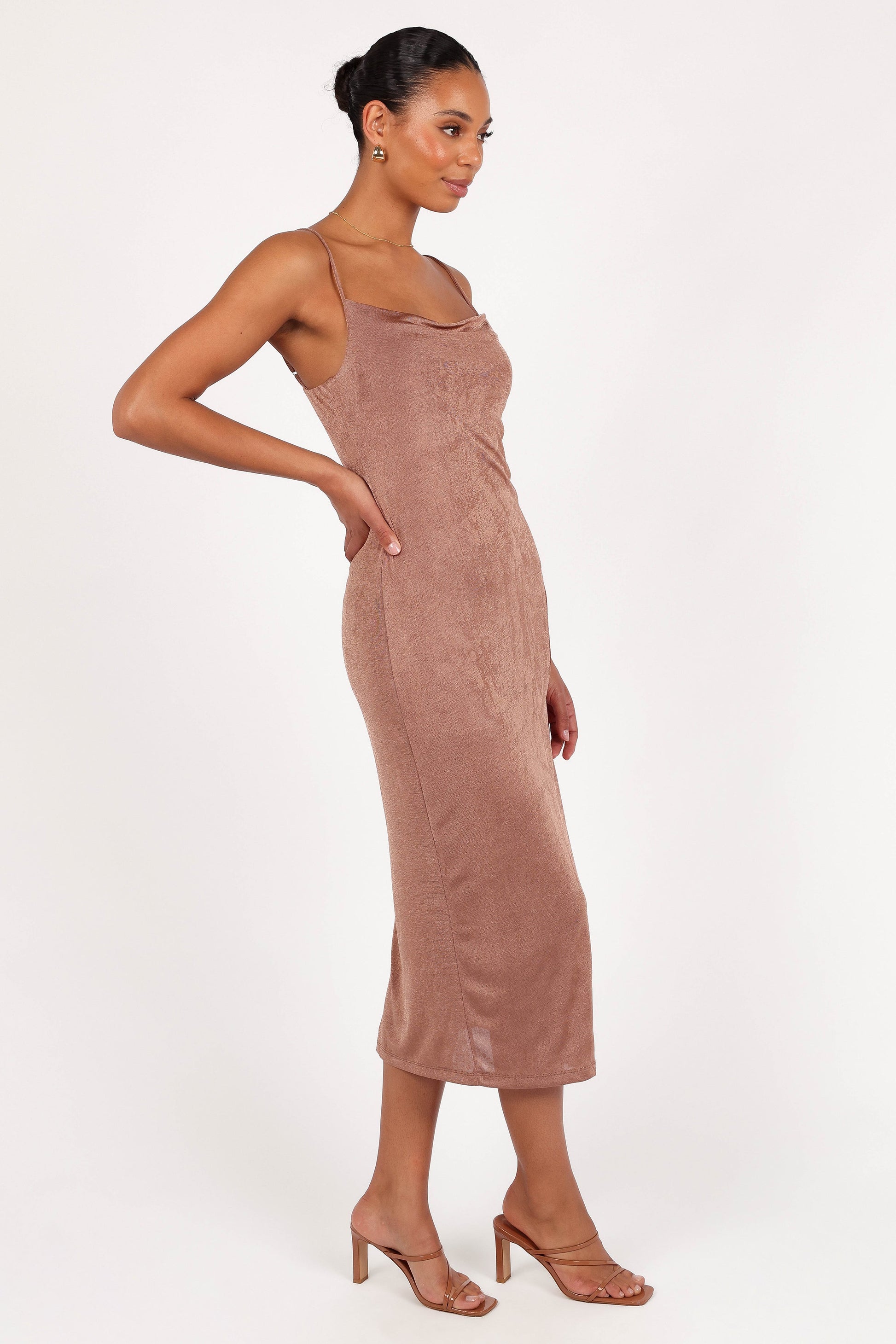 If you're looking for the perfect party dress, then look no further! Our bodycon midi-length dress with cowl neckline, thin cami straps and a front split is the ideal choice. The shimmering sheen finish material will give you an added sparkle to your style on those special nights out.