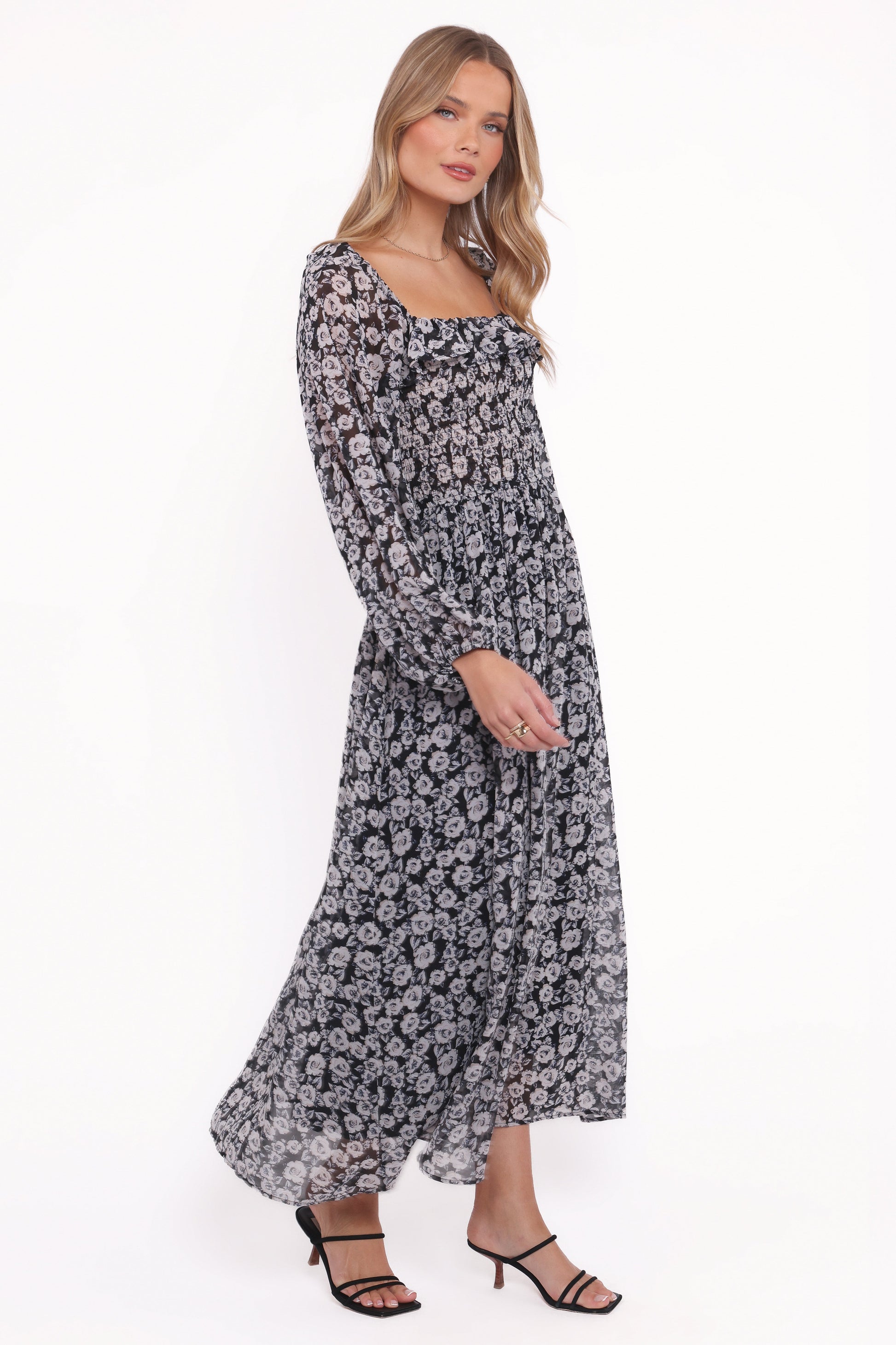 The Faith Long Sleeve Maxi Dress in Black Floral is your go-to piece for effortless elegance. Featuring a flattering square neckline and an elasticised shirred bodice, it offers a comfortable fit that molds to your shape.