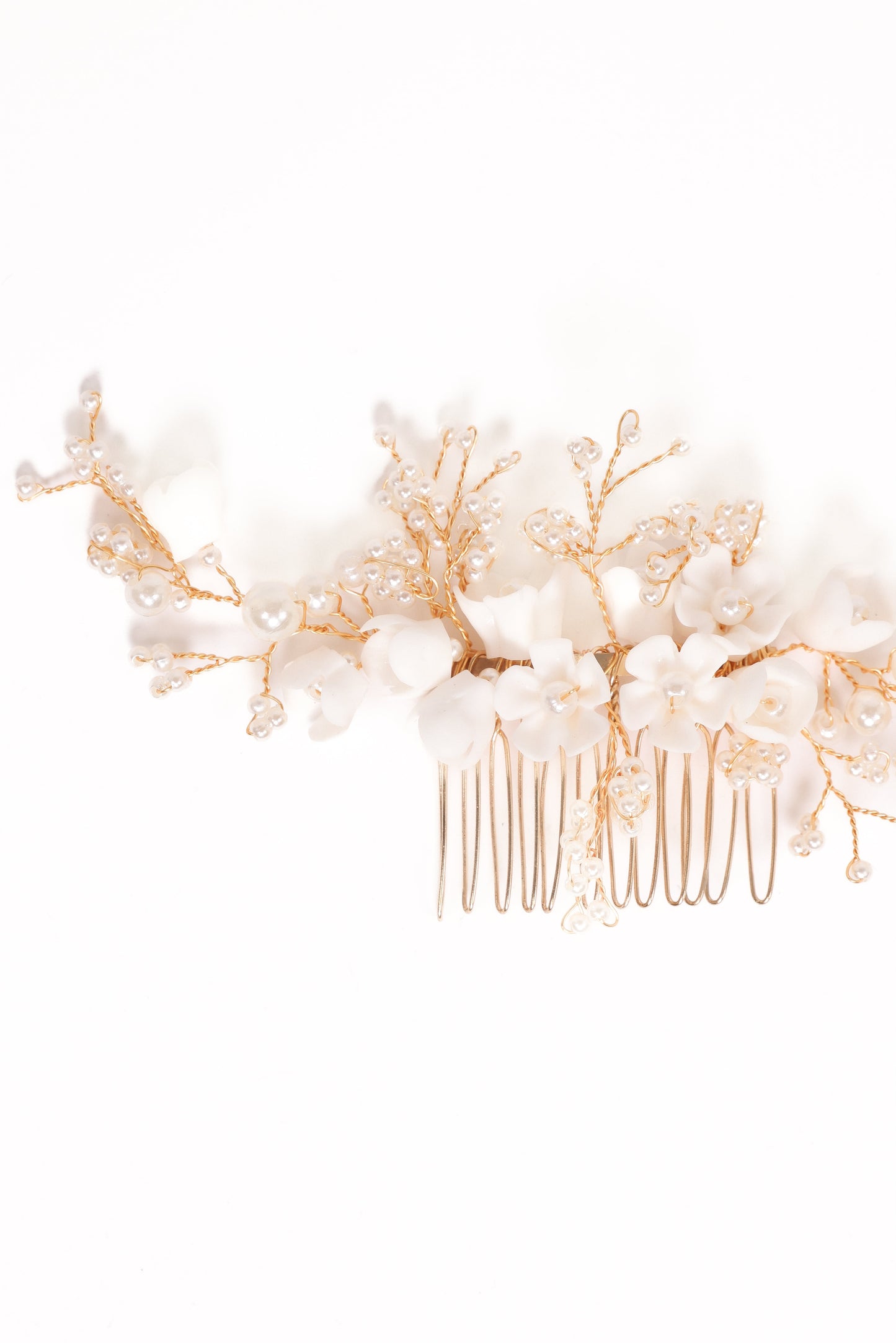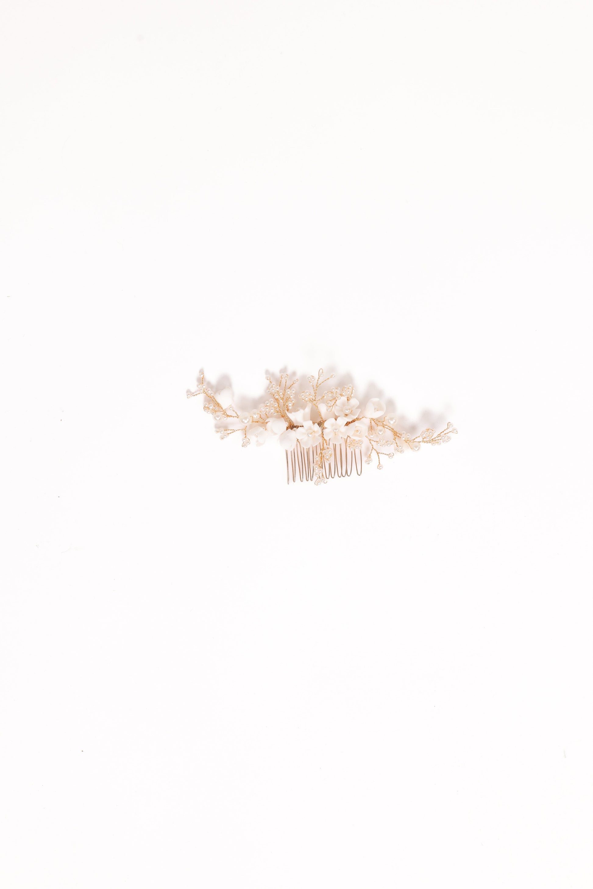 Add an enchanting touch to your hairstyle with the Geraldine Hair Comb - White. Designed with delicate bead and floral accents, this comb effortlessly combines timeless charm with modern sophistication.