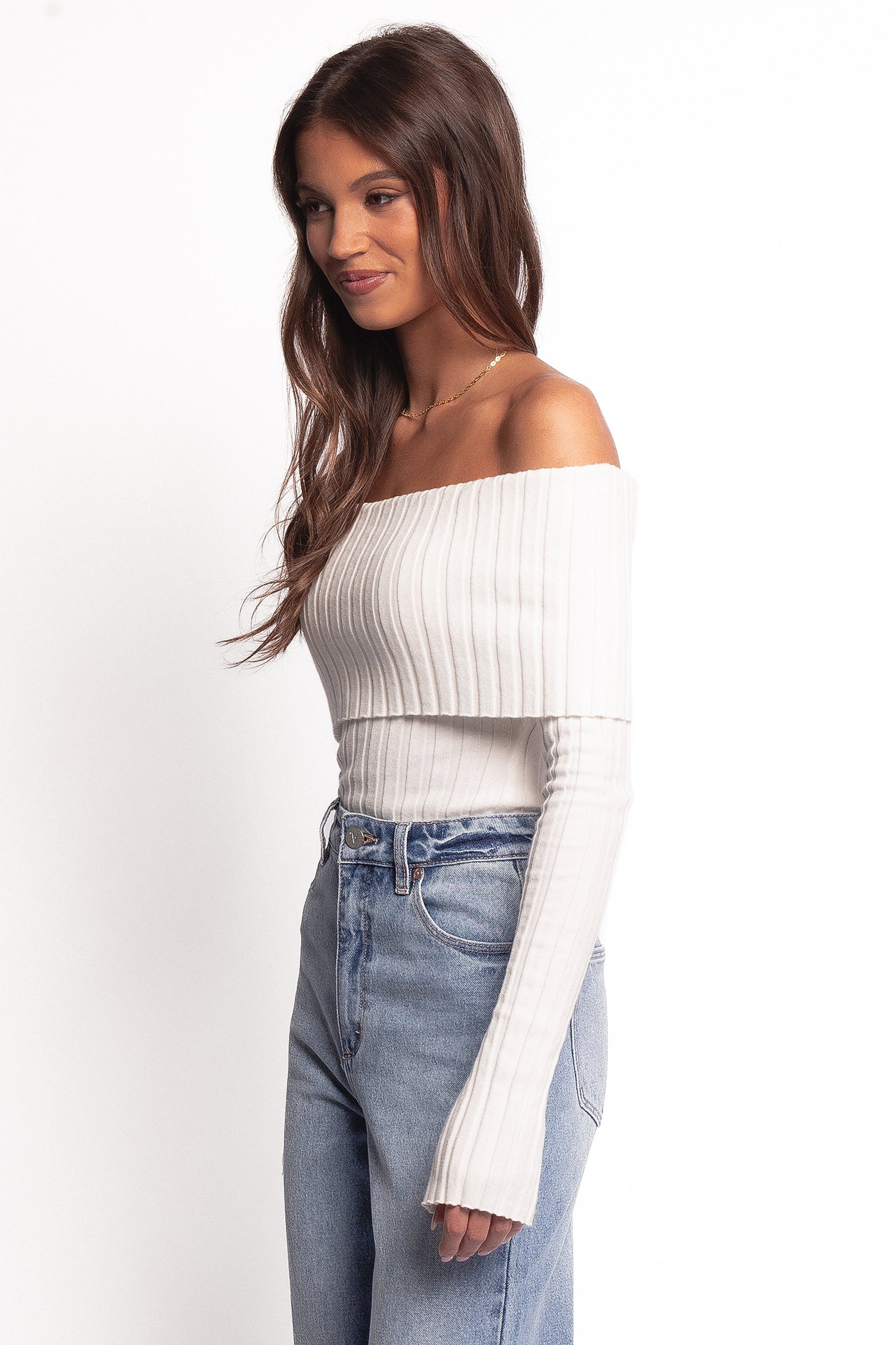 Effortlessly chic and beautifully detailed, the Inora Off Shoulder Knit top is your wardrobe's new statement piece. Designed with a fold-over straight neckline, it gracefully highlights your shoulders, adding just the right amount of elegance to your look.