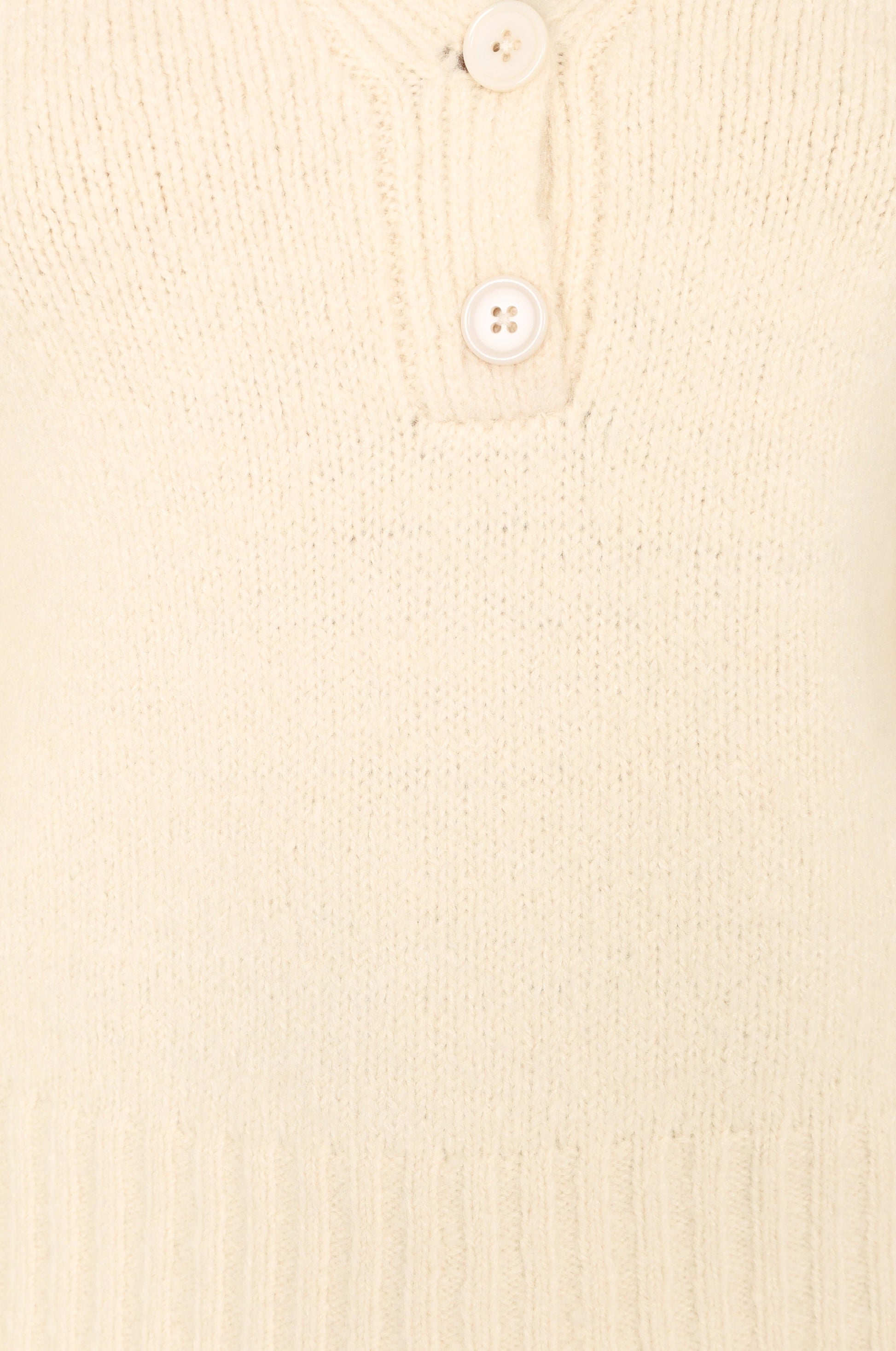 This cozy knit sweater is the perfect addition to your winter wardrobe! Crafted from a soft beige material, it features a flattering v neckline and spread collar with functional buttons down the front.