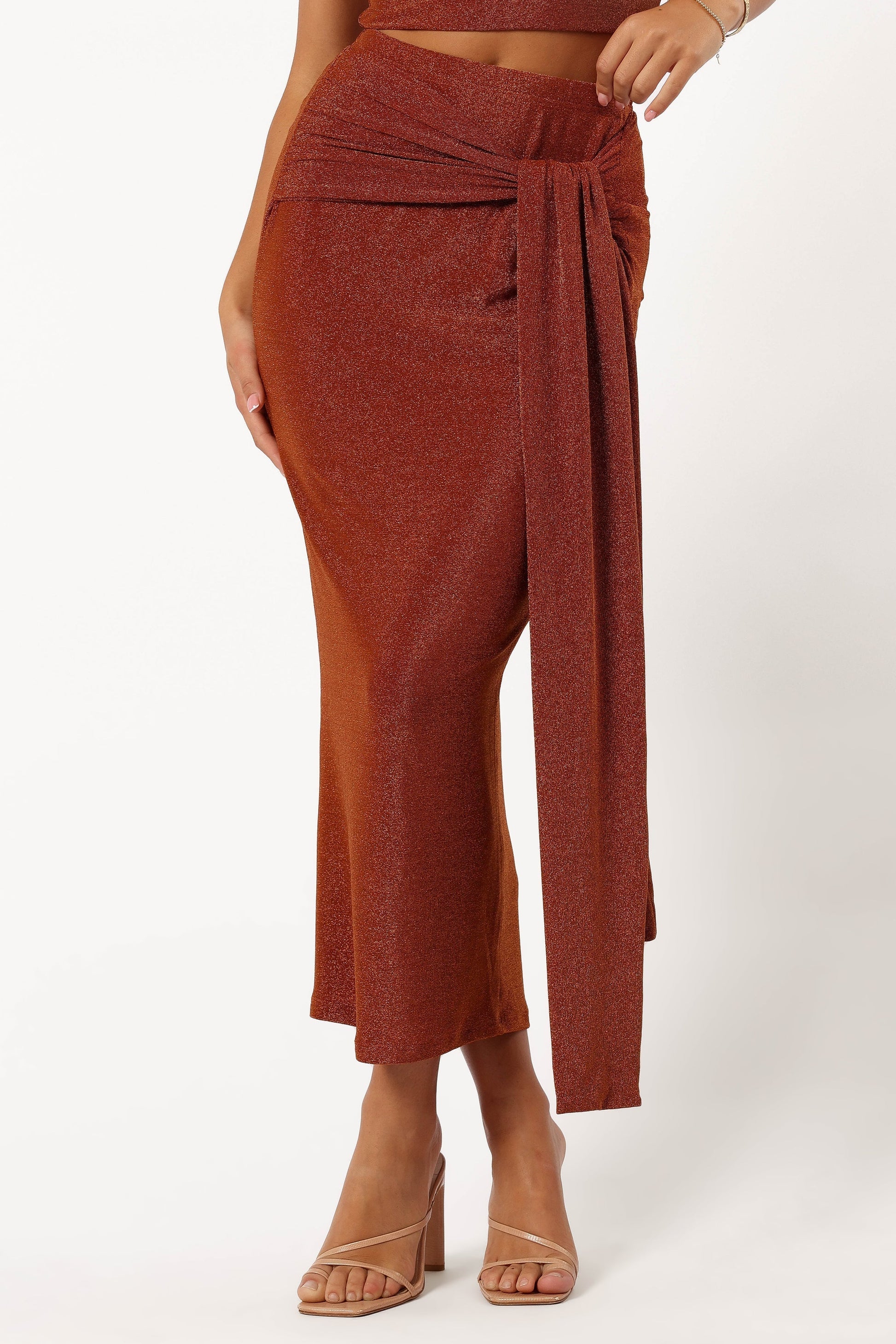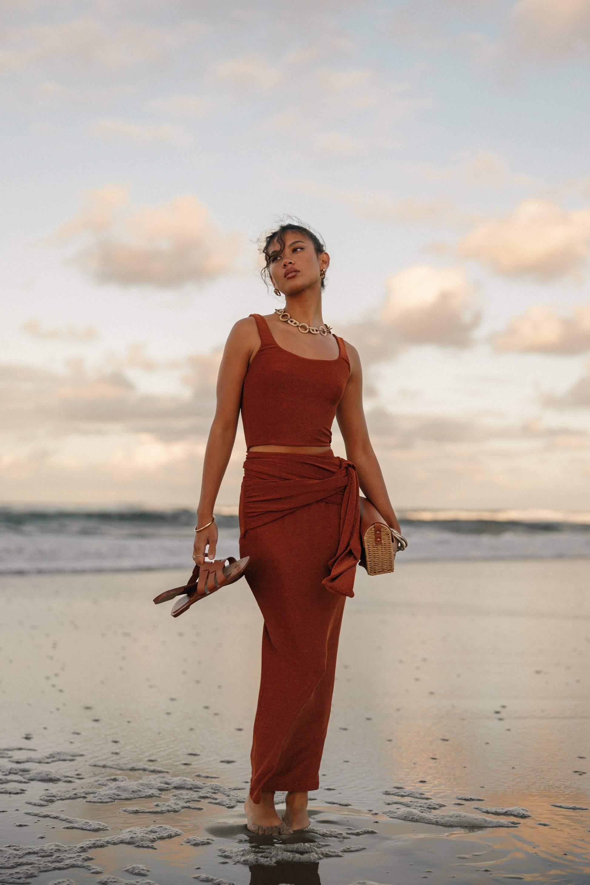 Look no further than this stunning top and skirt set in a sleek bronze glitter material. With a cropped length top featuring a round neckline, and non adjustable straps to ensure comfort - it's the perfect outfit for any event.