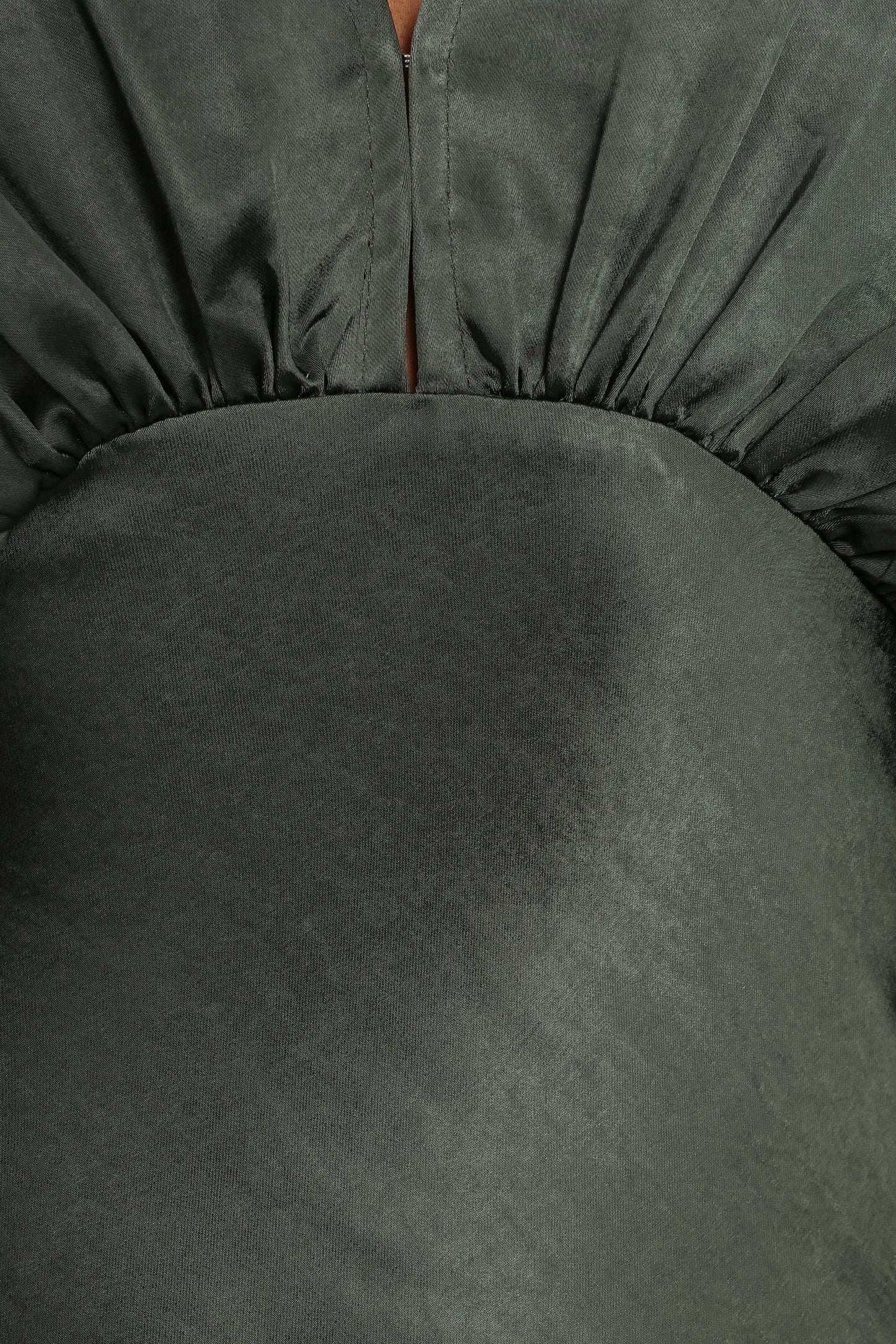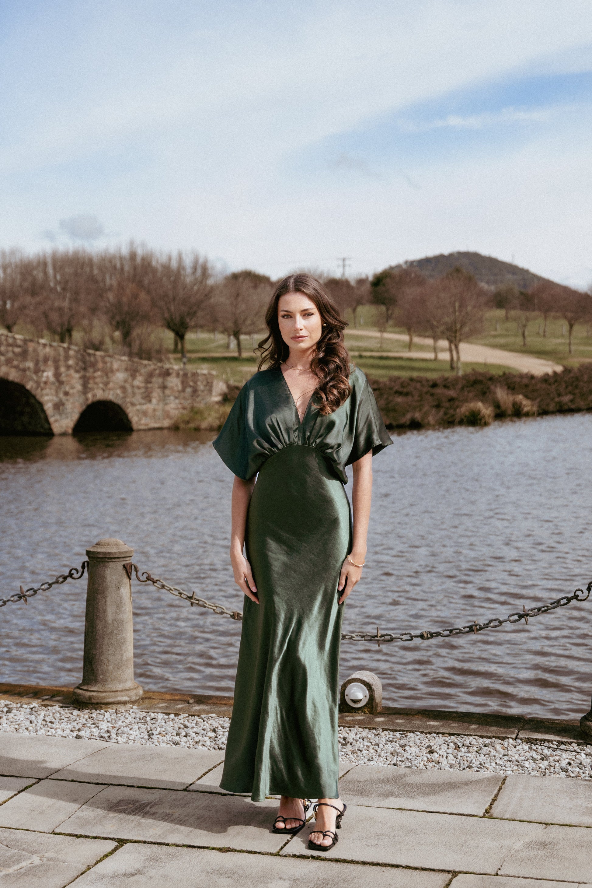 This elegant maxi dress is perfect for any special occasion. Made from a soft satin-feel fabric, it features a V neckline and hook and eye closure. The short sleeves and gathered bust detail create the perfect silhouette.