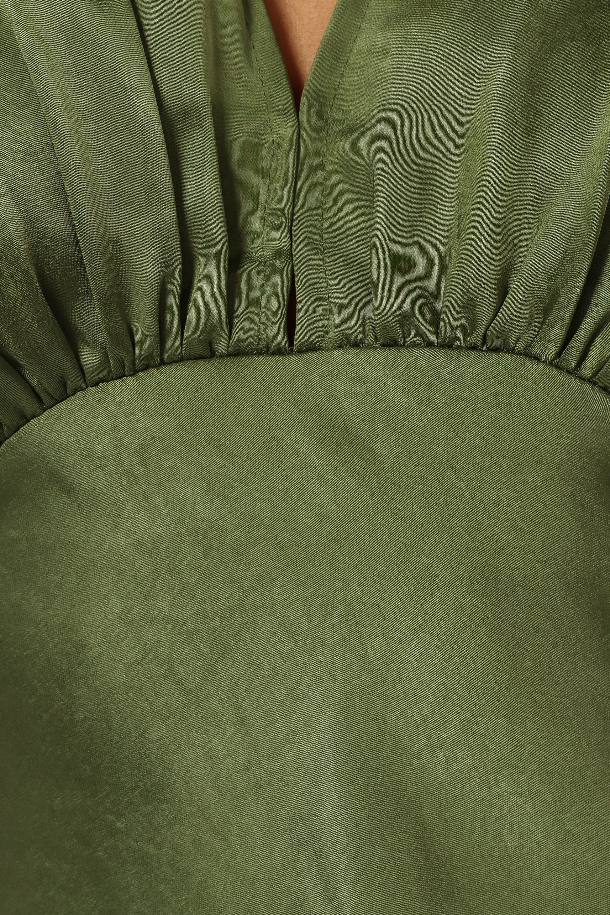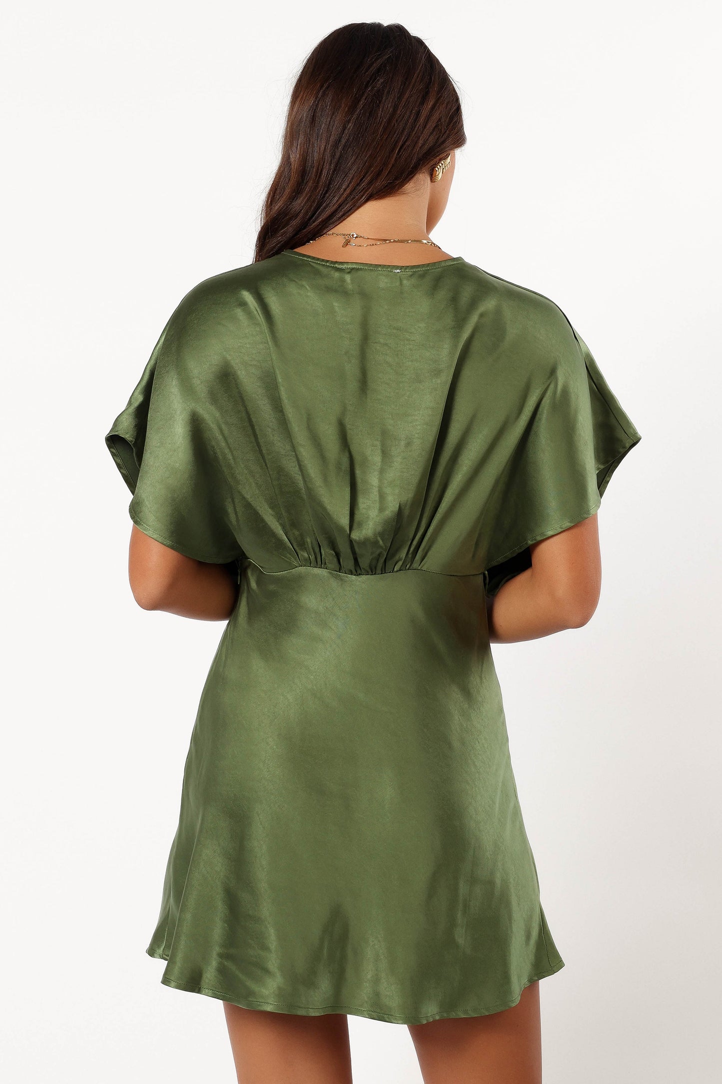 This elegant mini dress is perfect for any special occasion. It features a v neckline with hook and eye closure, gathered bust detail, and short sleeves. With it's satin sheen finish you'll be sure to turn heads wherever you go!