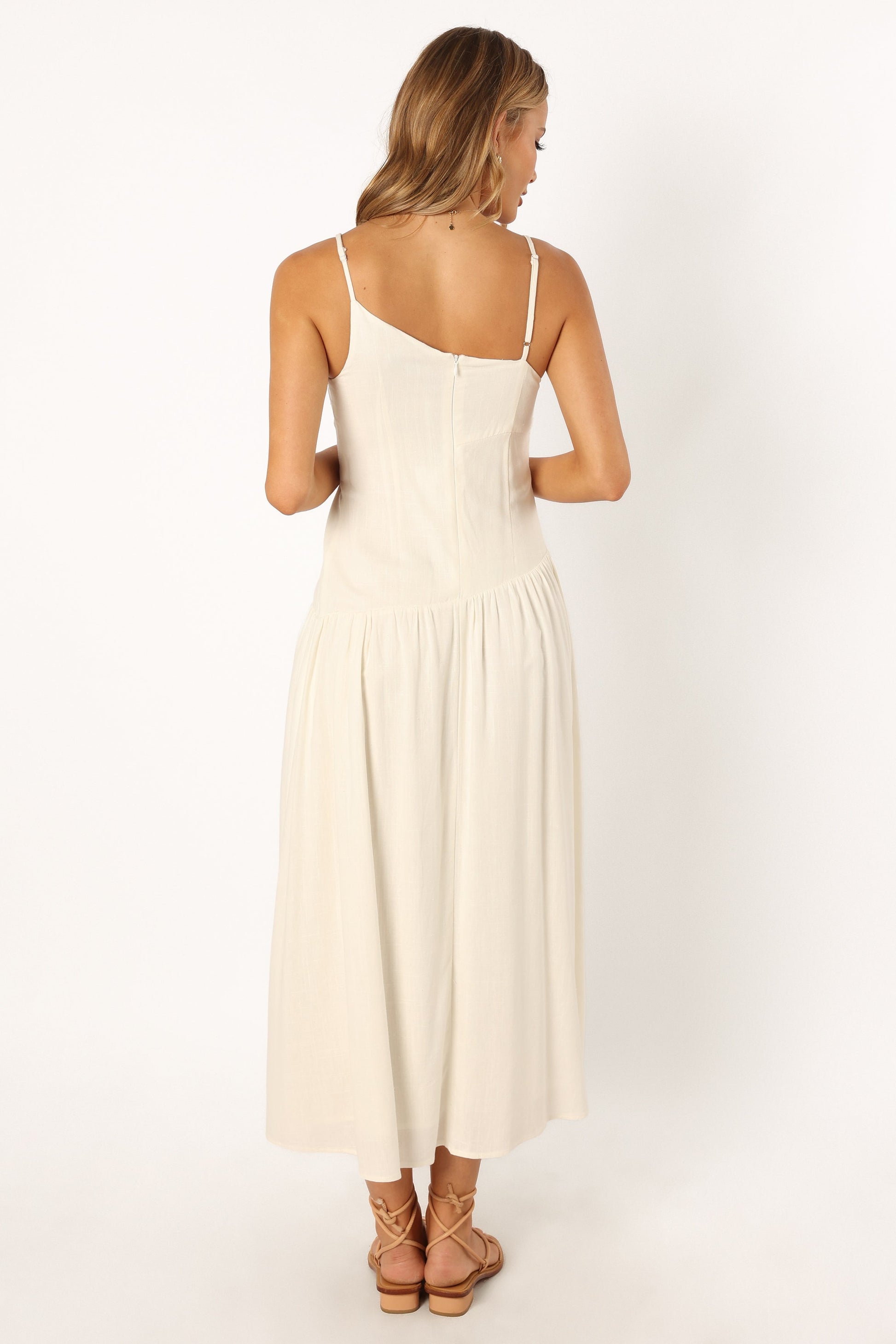 This midi dress is a must-have for your wardrobe! Its adjustable shoulder straps make it the perfect day-to-night look. The asymmetric detail give a hint of femininity to the outfit.