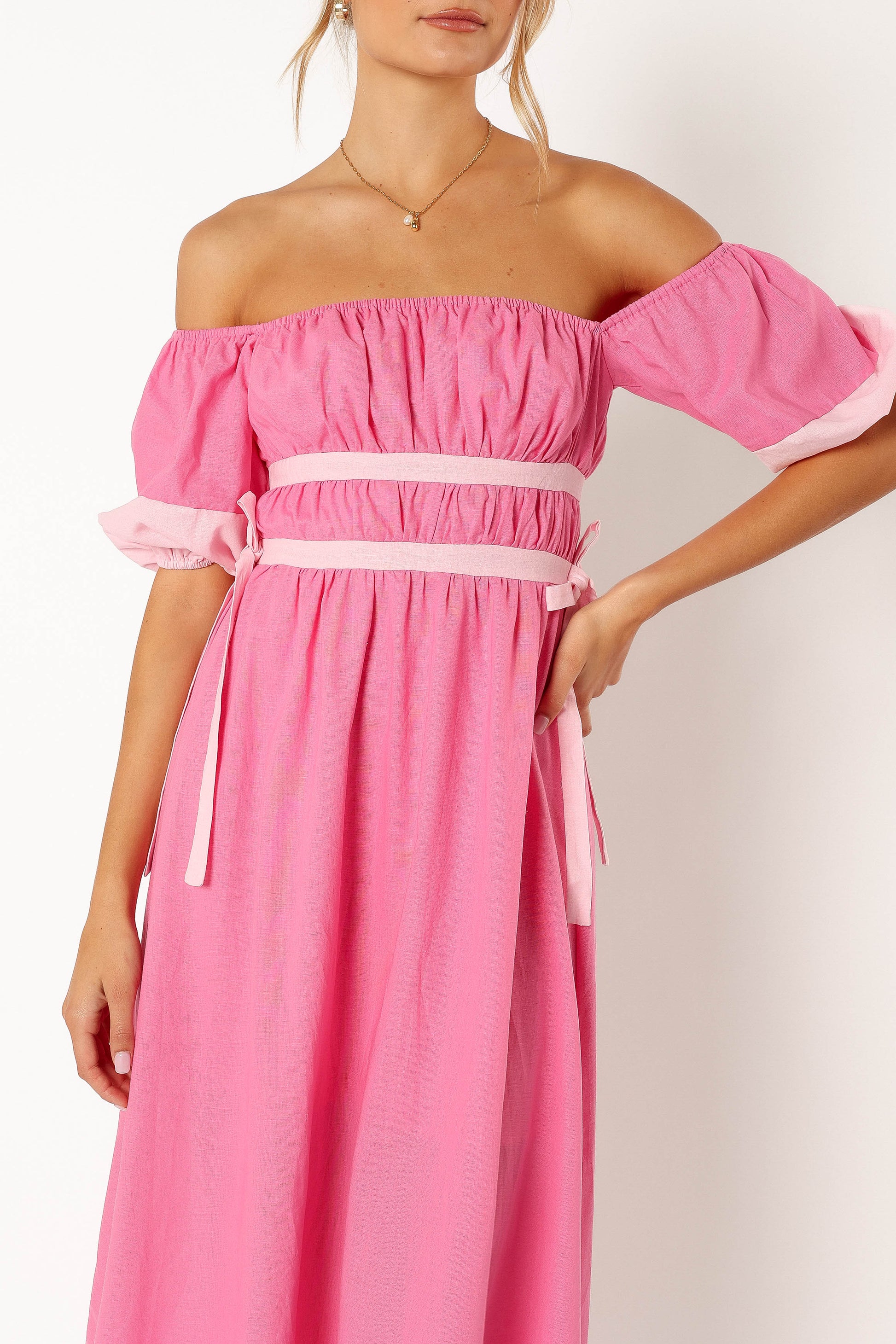This season's must-have is the perfect midi off shoulder dress! With its straight elasticised neckline and short sleeves, this style is sure to flatter any figure and make you look your best.