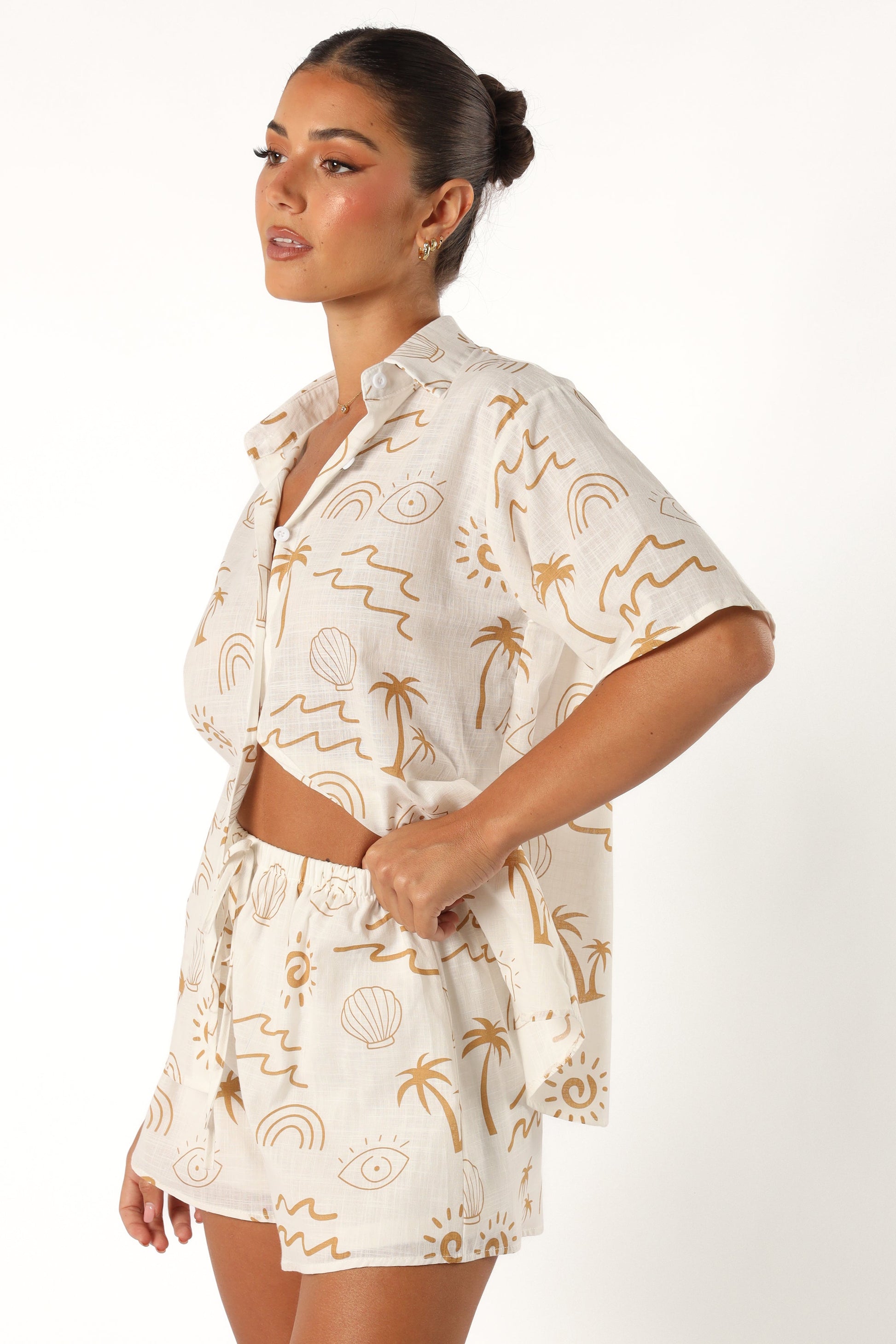 Say hello to summer with this fun top and shorts set! This two-piece ensemble features a spread collar, V neckline, short sleeves, and front functional button close. The high waisted style shorts come with an elasticised waistband and functional drawstring detail for added charm.