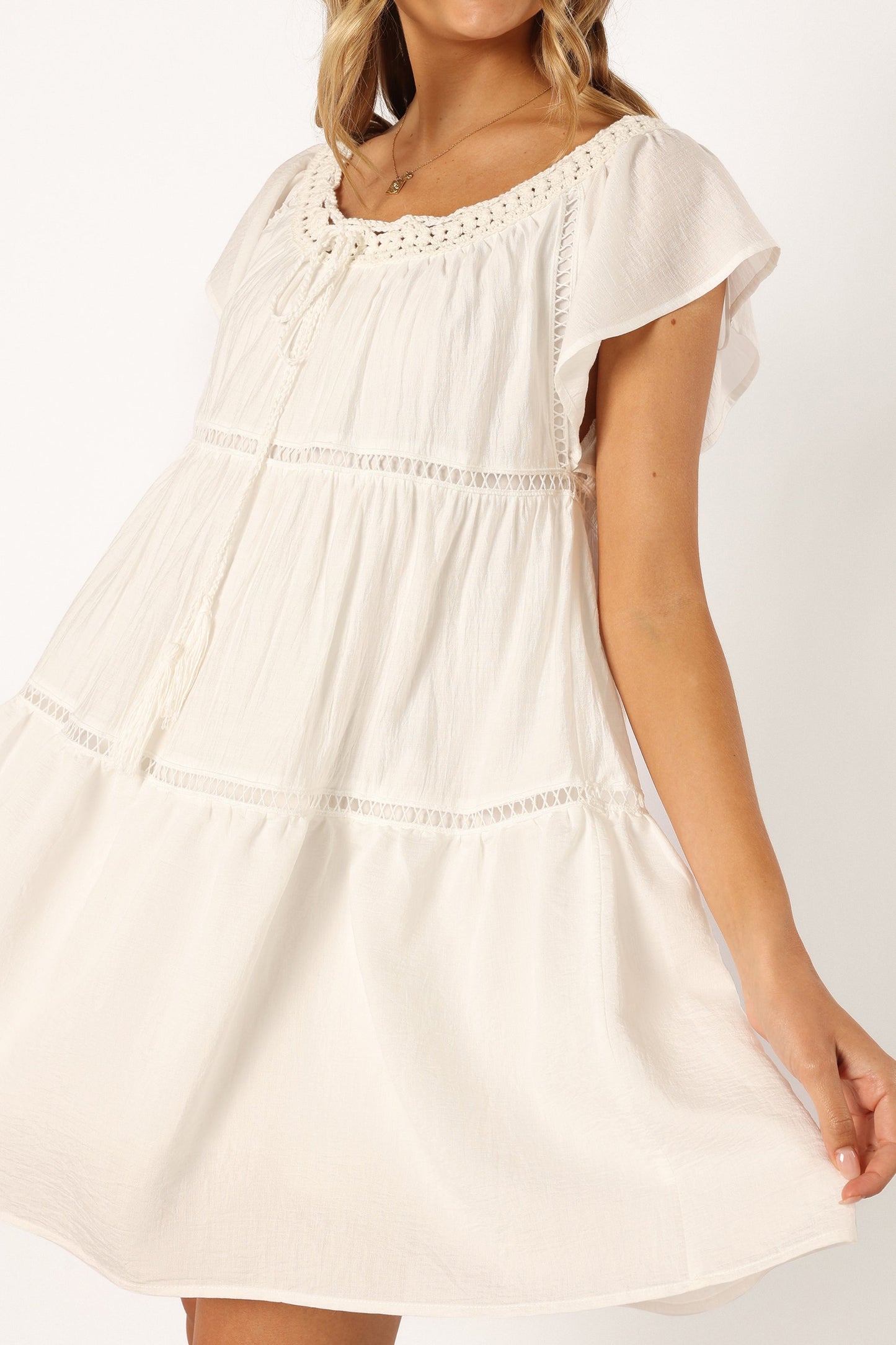 The Ulla Mini Dress is a versatile and stylish piece that can easily elevate any wardrobe. Its mini length creates a fun and flirty silhouette, perfect for any occasion. The round neckline with crochet trim adds a delicate touch, while the short ruffle sleeves add a feminine flair.